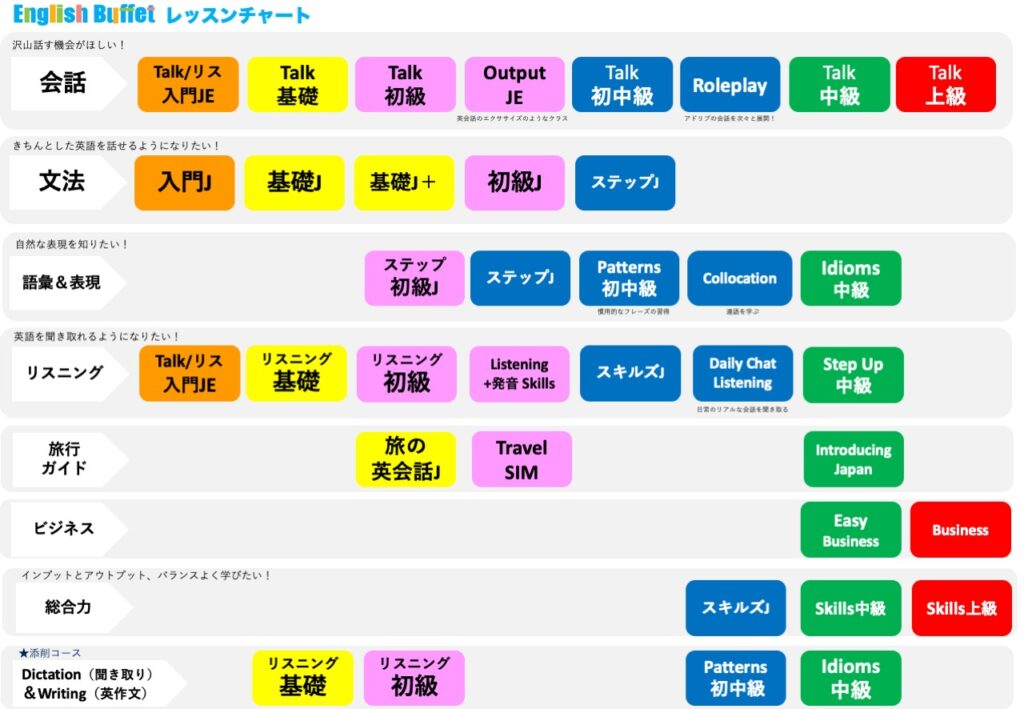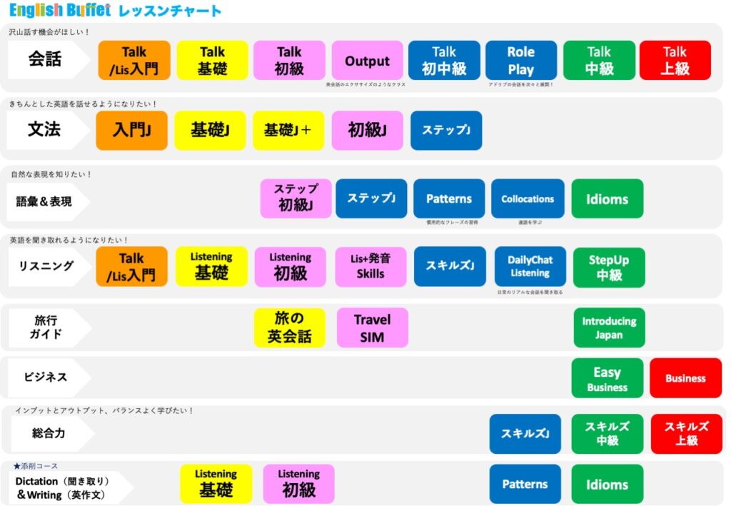 今回、目的別・レベル別に整理した「レッスンチャート」をご用意しました。
