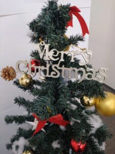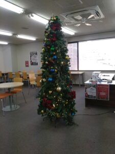 来校された方にクリスマスの雰囲気を楽しんでもらえるように、EBのフロアにクリスマスツリーなどの飾り付けをしました🎄🌲🎄